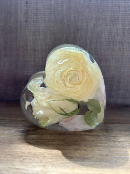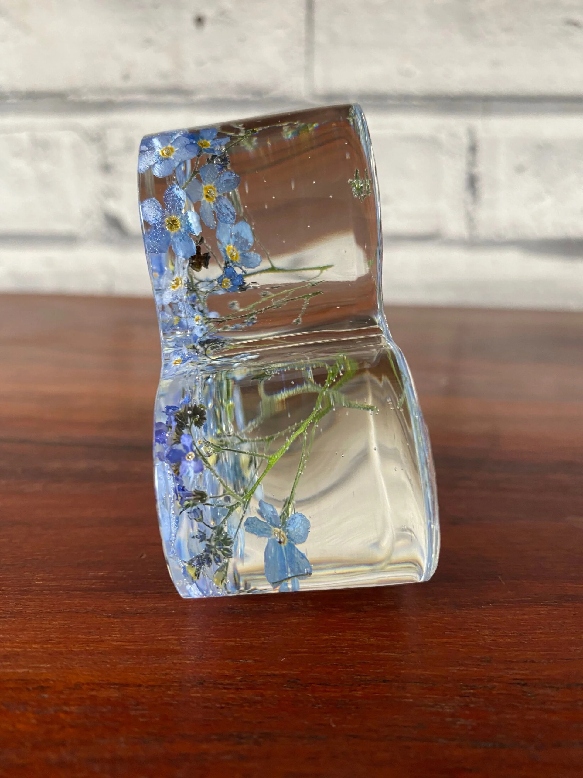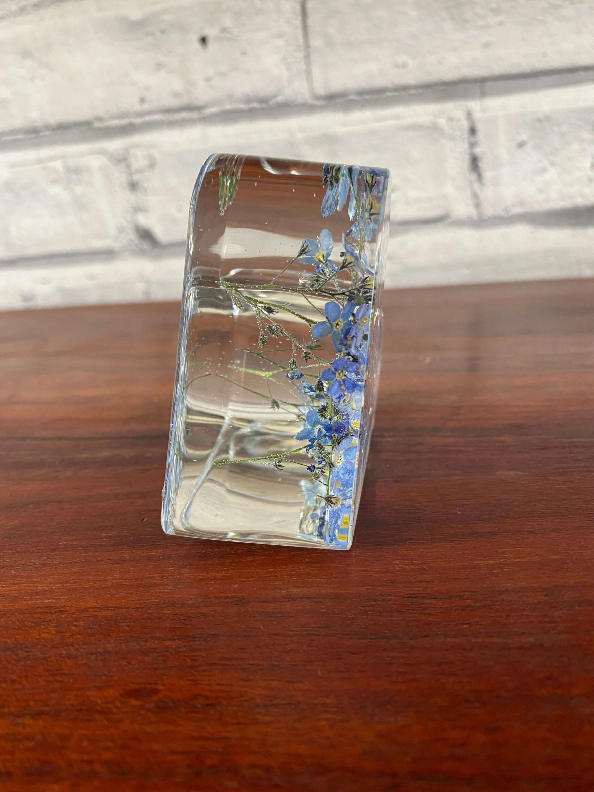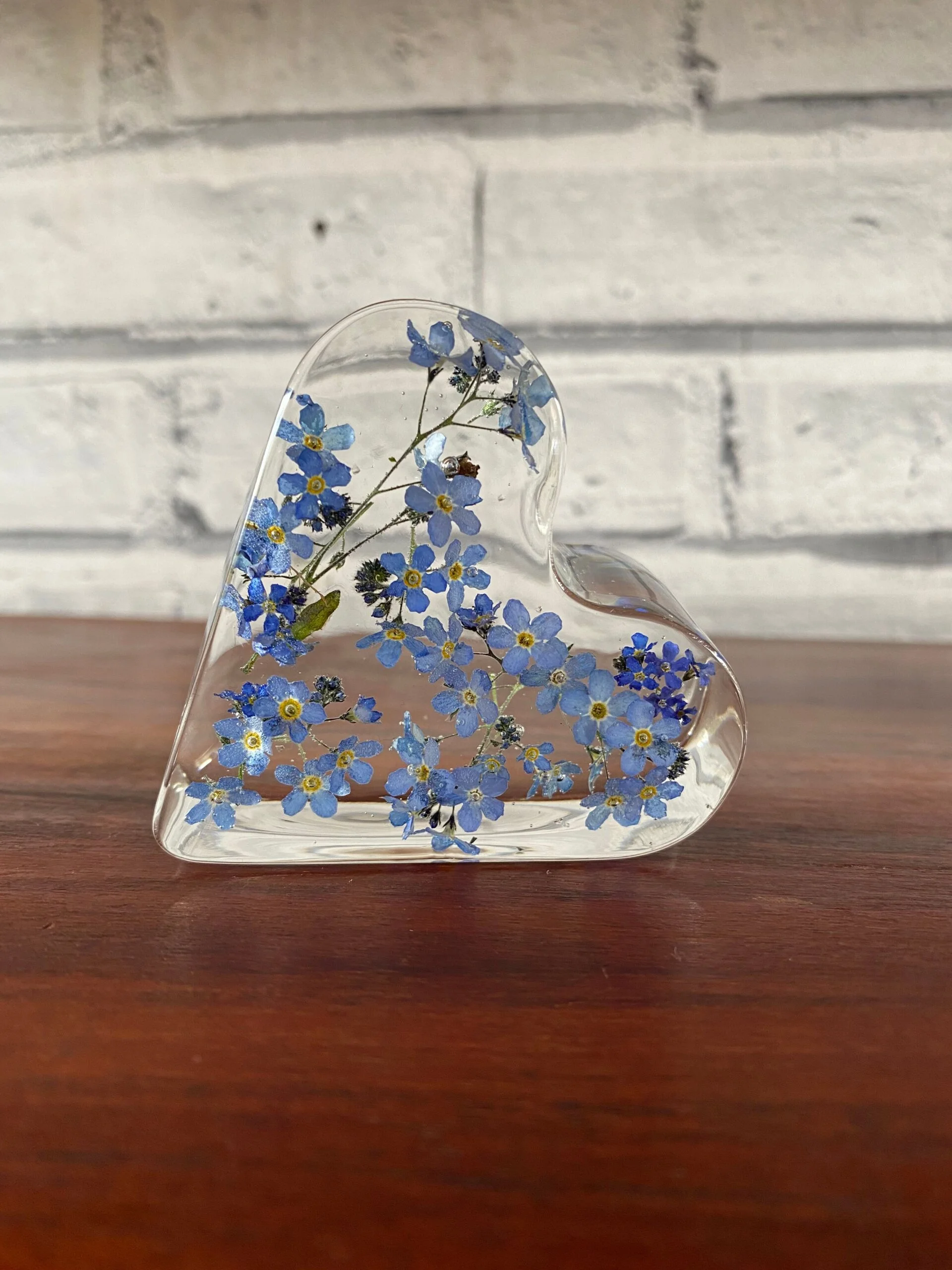 This stunning 7cm resin heart is handcrafted with real dried forget-me-not flowers.