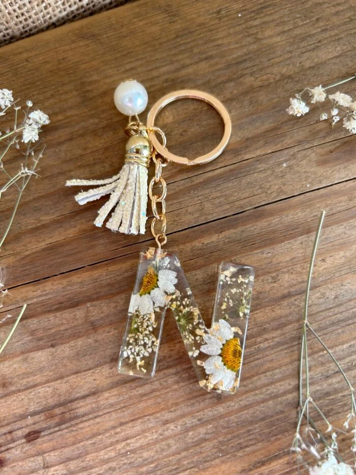 Our Floral Daisy Resin Keyrings will add a touch of natural beauty to your keys. Each keyring contains a bright daisy, lace flower and gold leaf detail, all enclosed in crystal-clear resin, ensuring its beauty for years to come. They come complete with a gold-style chain and a leather white glittering tassel.